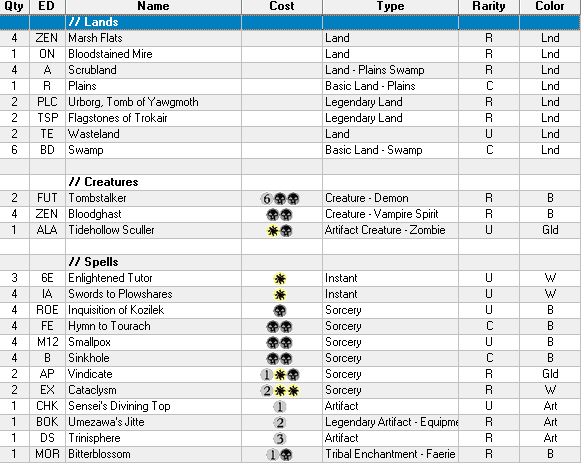 TombStalker: If I ran a true creature in the deck iw ould drop the Nether Spirit. The problem then is the first time you cast Small/Pox you lose it. It doesn't take the hit and keep on ticking. Plus it cant just eat up removal. Not the removal spells in my opponet's hand have real value beyong buying them a turn or two. Plus, with BitterBlossom, I dont think TombStalker is really that important.