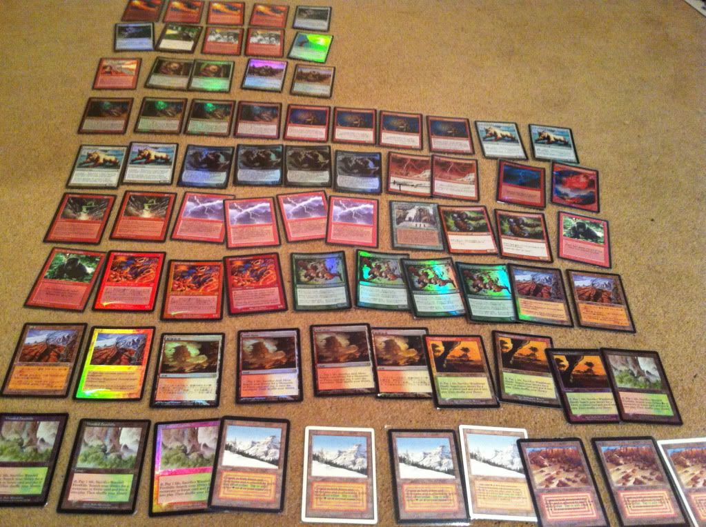 Going to post Fugly foil burn in a few days. Comprised of 4 Fire and Lightning decks, along with promo Rift Bolts. Sadly, I have yet to find foil Lava Spikes or Goblin Guides. Couldn't resist when target had them for 17 bucks a piece.