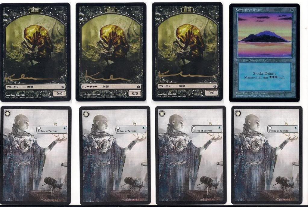 ...and today a package arrived with the last 2 cards, a common and a rare, for my 2nd german foil urzas legacy set! the 2nd one has a better overall condition (NM+ average) than my first set, but two cards are signed, but they are no moneycards anyway