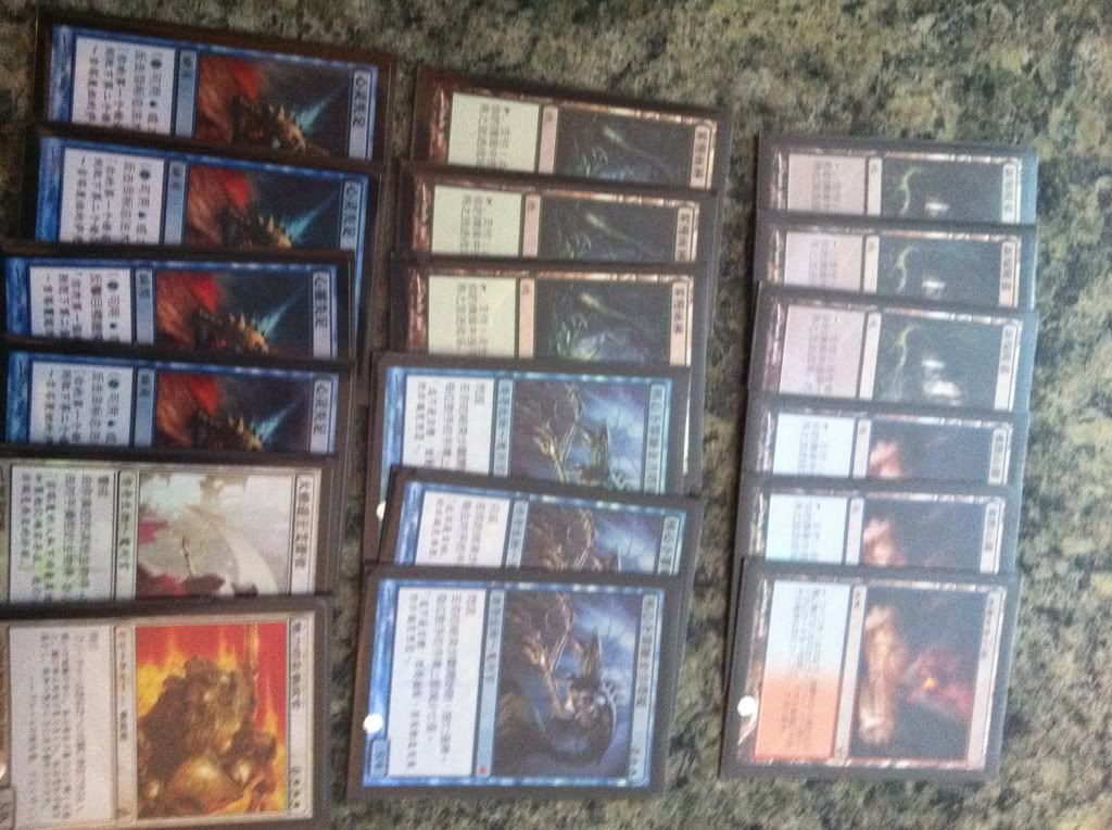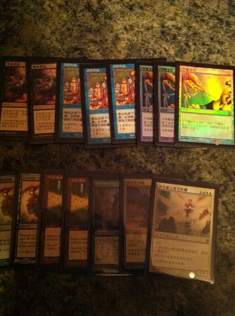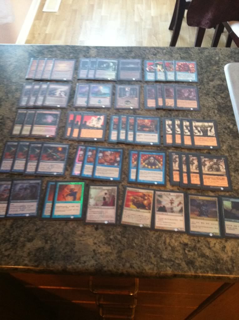 Here is my deck, excuse the nasty sleeves, FNM Brainstorms, Slaughter Pact, and the white border Sea. All the non-foil cards are in Spanish or Italitan (duals).