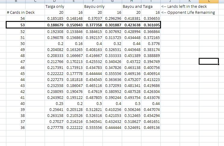 Taking all of this into account, if you draw your opening hand of 7, cast any Land Grants, and then Belch your opponent who is at 20, a build with only Taiga has a 9% chance of fizzling, while a build which also has Bayou has a 31.6% chance of fizzling if you fetch Bayou with your first Land Grant, and 37% if you fetch Taiga first. Assuming I don't suck at math. EDIT: Actually, I do, the odds for single Bayou/Taiga/Land Grant are wrong; they should be lower than they are. Hence, so are the numbers for the Bayou builds, which should be worse than they are. Let me redo that.