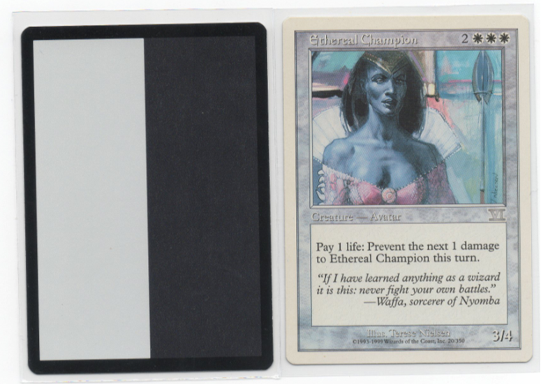 Wanted to post the filler by itself, but realised I don't have such a scan. The filler is a foil #015. First filler which started my filler collection :) The other card is a very discoloured, pseudo-albino Ethereal Champion (normal picture here). This one is definitely legit, and has not been bleached. I've got a similar brainstorm and some other playables that I will post next time.